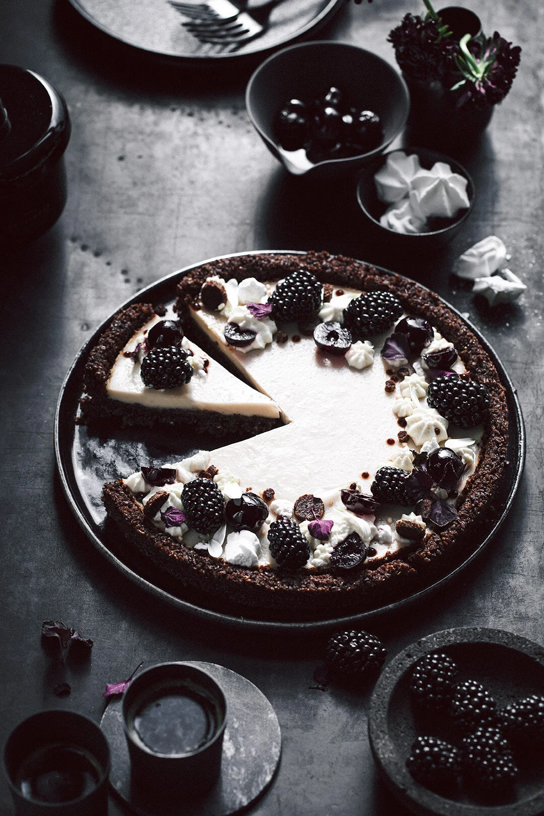 Tarte mit Brombeeren auf dunklem Untergrund =editorial